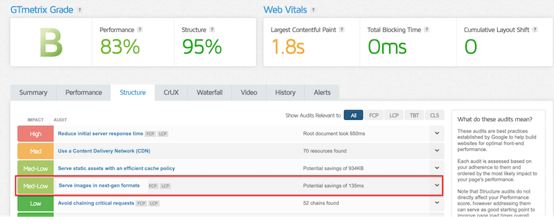 Look, as the GTmetrix audit below shows, one of the key recommendations for improving your site speed is to serve images in next-gen formats like WebP: