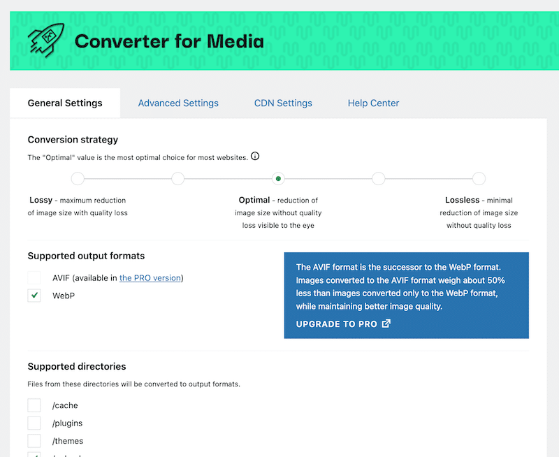 - It automatically generates WebP or AVIF when you upload images to the Media Library.