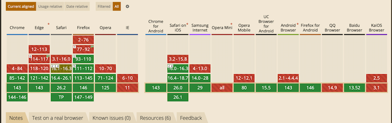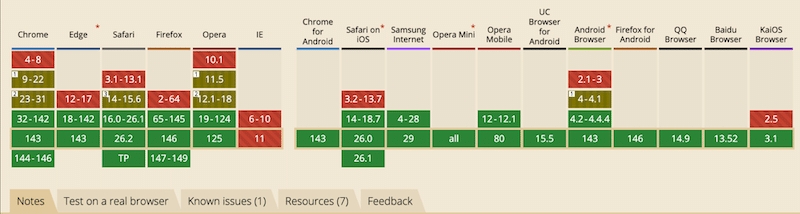 | Browser support | Universal support across modern browsers | Growing support may require fallbacks for older browsers (e.g, mini opera or QQ) |