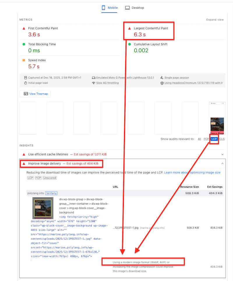 - Lighthouse recommended converting images to WebP or AVIF and applying compression
