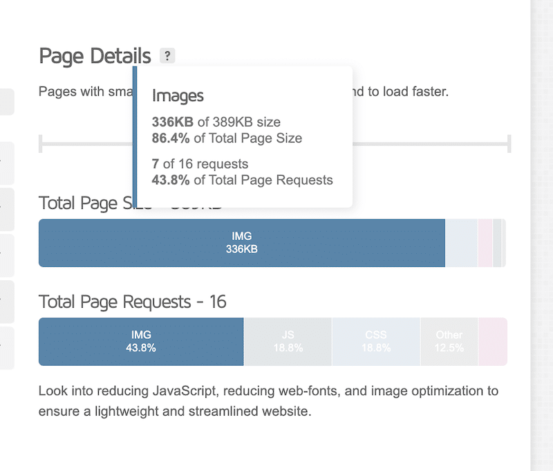 Images are often the heaviest assets on a webpage. For example, in our example, images take up almost 90% of the total page size and almost half of the request: