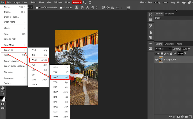 Photopea is a free, advanced image editor similar to Photoshop. It allows you to edit images and manually export them as WebP or AVIF using the “Save for Web” or other export options.